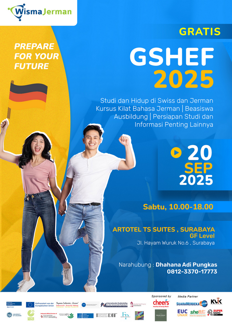 Salah satu komitmen Wisma Jerman dalam dunia Pendidikan, GSHEF (German Swiss Higher Education Fair) kembali hadir di tengah-tengah sobat Wisjer. Seperti sebelumnya, pameran ini menghadirkan sejumlah organisasi lokal dan Jerman yang berspesialisasi dalam dunia pendidikan secara akademis maupun vokasi (kejuruan). Melalui acara ini sobat WisJer bisa mendapatkan ruang informasi dan wawasan yang lengkap tentang studi […]