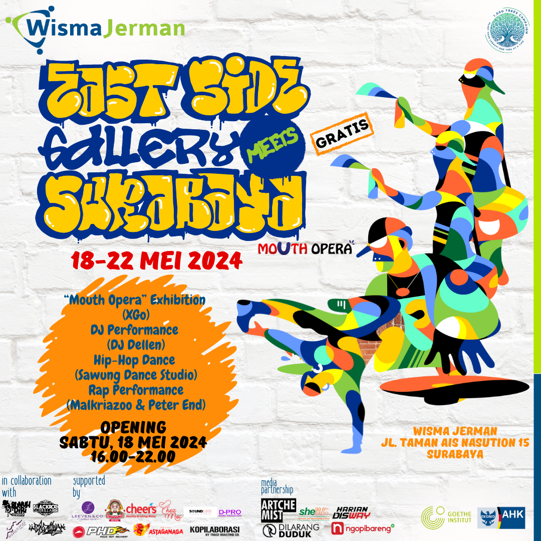 As part of the event “East Side Gallery Meets Surabaya”, Wisma Jerman hosted the “Mouth Opera Art Exhibition” by XGo. XGo is a visual artist from Surabaya focusing on street art and urban art. As a street artist, he is creating works in the form of murals, graffiti, stencil art and wheat paste since 2000.