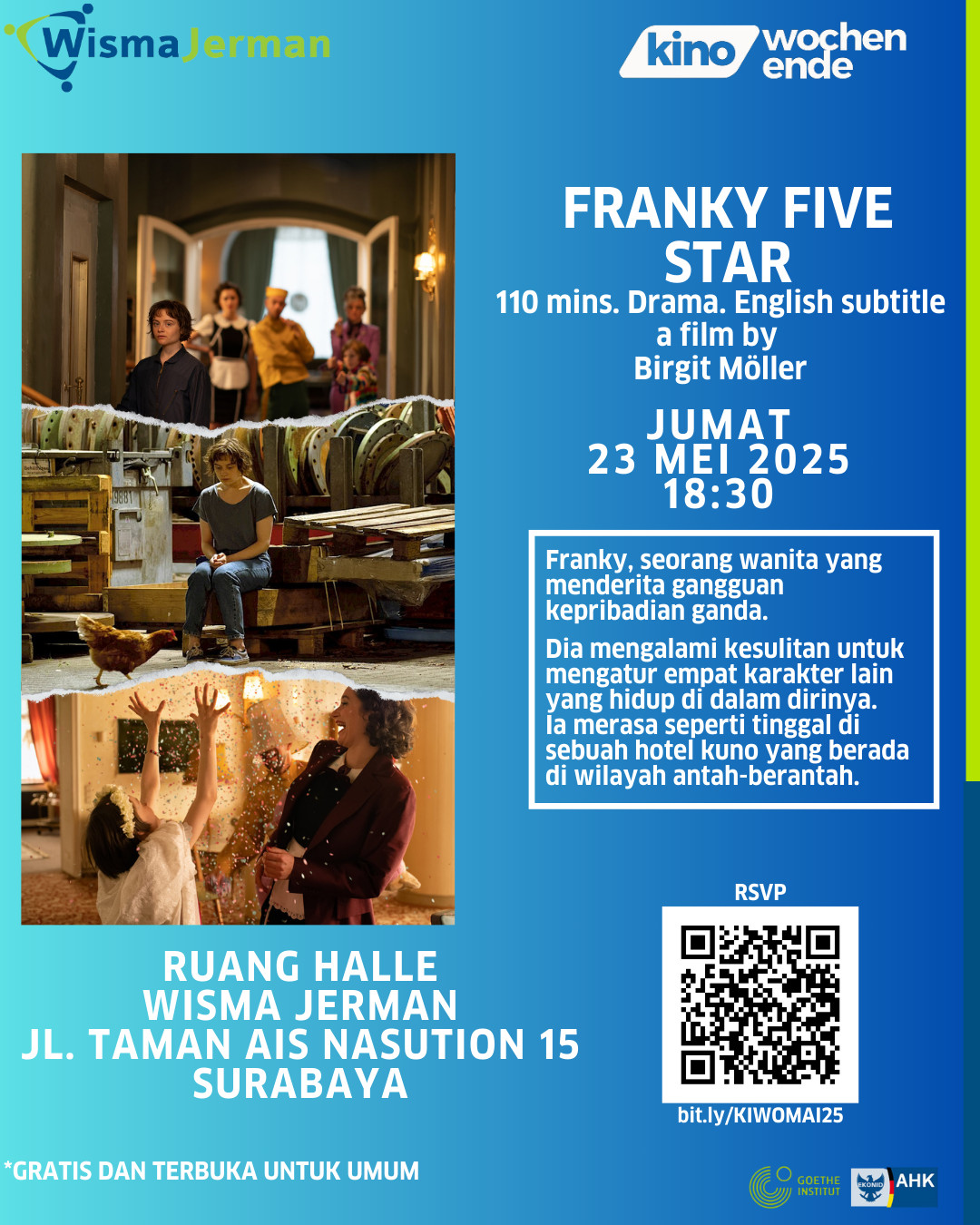"Franky Five Star" 110 menit, English subtitle.  Ruang Halle, Jumat, 23 Mei 2025 pukul 18:30.    Franky, seorang wanita yang menderita gangguan kepribadian ganda. Dia mengalami kesulitan untuk mengatur empat karakter lain yang hidup di dalam dirinya. Ia merasa seperti tinggal di sebuah hotel kuno yang berada di wilayah antah-berantah.    RSVP: https://KIWOMAI2025 Acara ini didukung […]