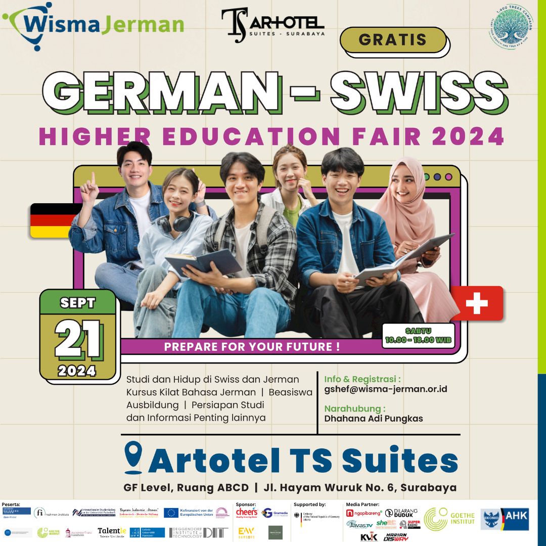 The German-Swiss Higher Education Fair (GSHEF) is an annual event organized by Wisma Jerman. Due to a growing demand for information about Germany and Switzerland as destinations for higher education, in 2024 the GSHEF was held on September 21st at TS Suites Artotel Surabaya.